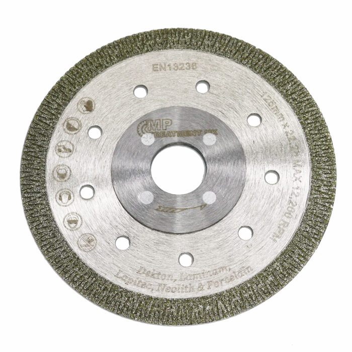 Experience world-class quality with our 125mm Dry & Wet Cutting Blade, meticulously crafted for cutting all sintered materials, including Dekton, Laminam, Lapitec, Neolith, and Porcelain. This blade features an electroplated K-Porcelain mesh design and a reinforced body with a 22.23mm inner bore, setting a new standard in cutting precision and longevity.